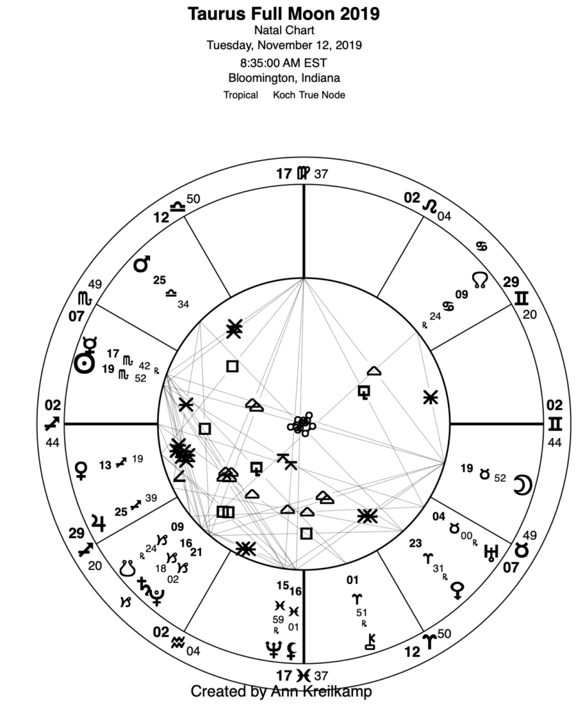 The Taurus Full Moon, at 19°52 Taurus/Scorpio, will provide a grounding, deepening, stabilizing influence during the final two weeks of this lunar cycle that saw pugnacious Mars squaring (igniting) breakups of deep old Saturn/Pluto structures (see recent posts) since the Scorpio New Moon. Whatever changes have been initiated, they are settling into place, becoming manifest. This is due, not only to the fact that both Scorpio and Taurus are fixed signs, but because both Neptune in Pisces at 15°59 Pisces and Saturn/Pluto at 16°18 and 21°02 of Capricorn create a harmonious double wedge formation (both with 120° trines and 60° sextiles) with this Full Moon.