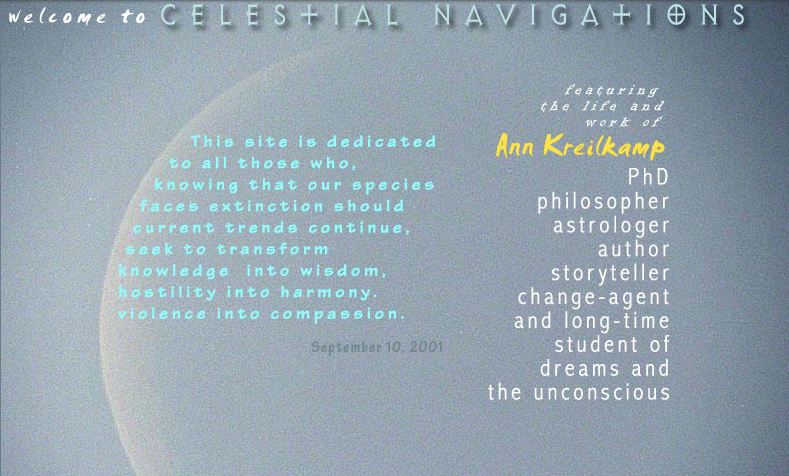 Fast forward to the year 2001, when I finally decided to put up a website that had my work on it only, and call it Celestial Navigations, in honor of my long time explorations as a professional astrologer. Here is the saved screenshot of the front page.
