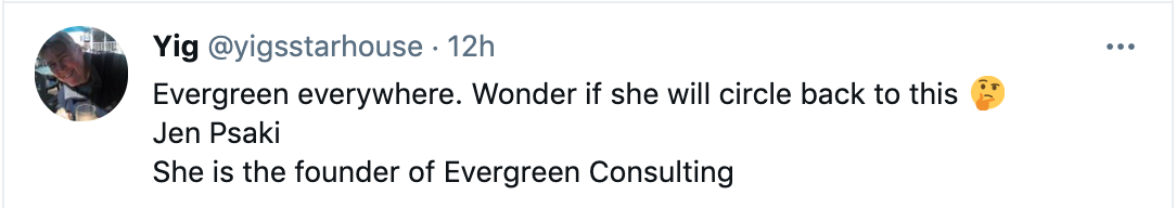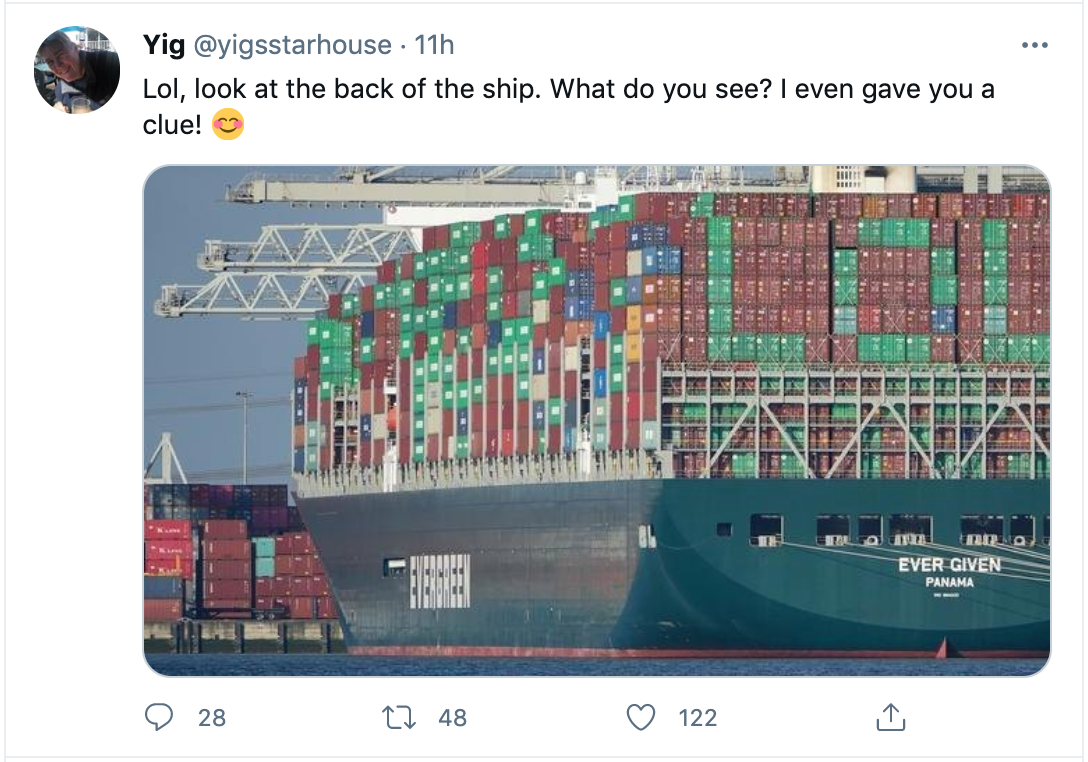 The shipping company Evergreen, not just HRC’s secret service name, but could be construed as that ever-flowing green currency, human trafficking. Also, the ship’s name Ever Given, lots of people are now calling it Greatest Red Pill Ever Given. And one more oddity?: