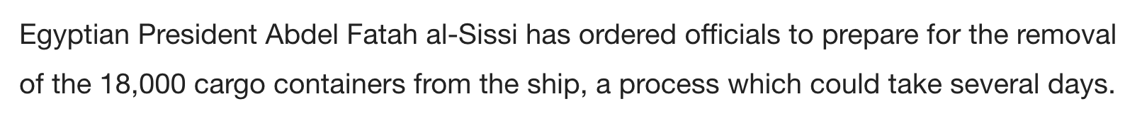 We now know that they tried with an armada of tugs to move it with yesterdays high tide, and only managed to nudge it 18 meters. We know that the President of Egypt has now issued an order to start unloading.