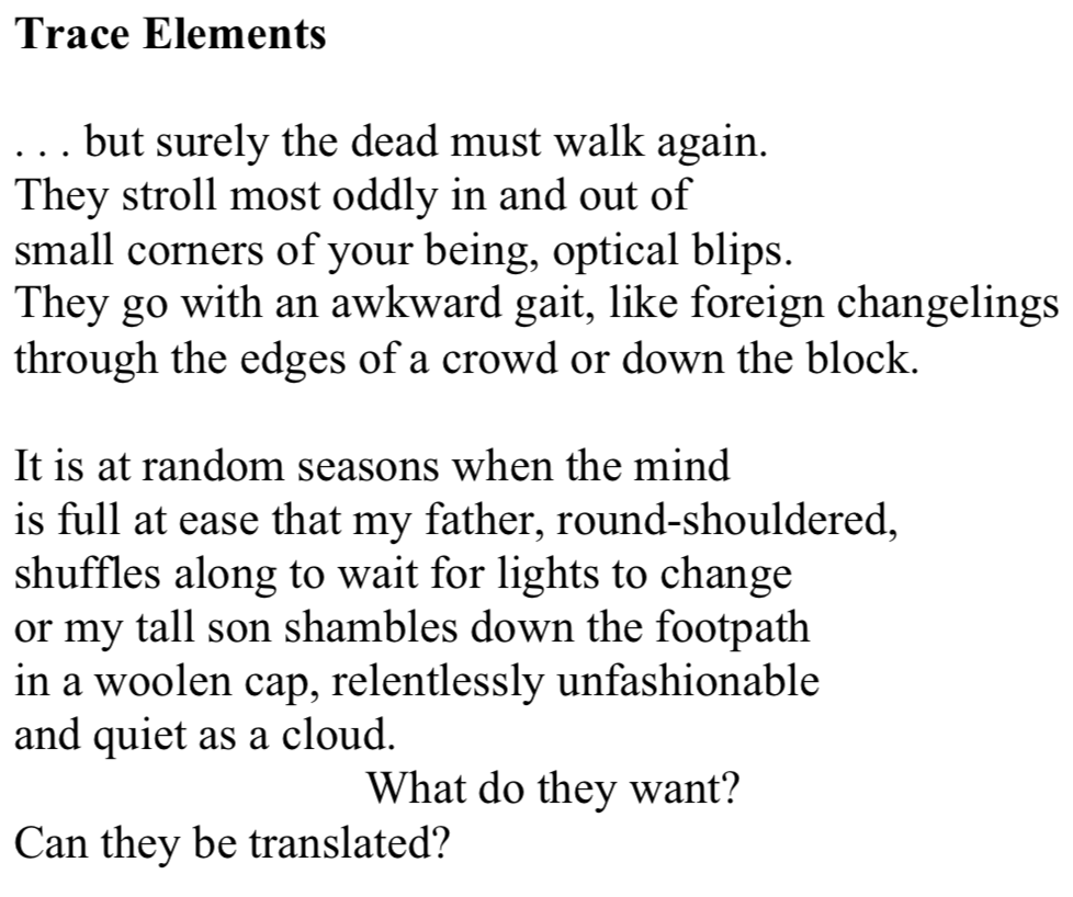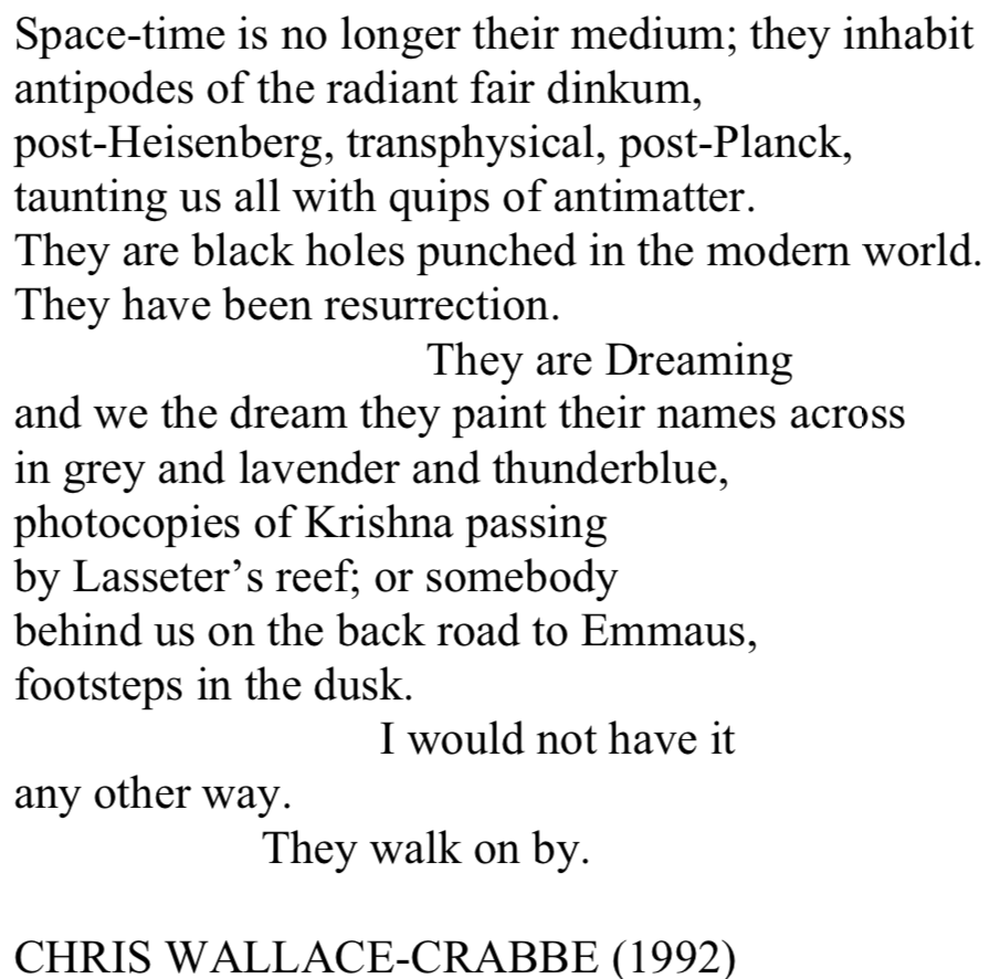 I’ve had screenshots of this poem parked on my desktop for months now. Time to post them, and a bit about the author, Chris Wallace-Crabbe, now 85 years old, whom I have never heard of until this poem which still holds me, despite the two Australian words that I had to look up — “dinkum,” (honest, true) and “Lasseter” (the discoverer of a rich gold mine in a remote region of central Australia) — in a sort of Neptunian trance, enchanted, spacey, bewitched. The way I am every time dark shadowy figures dart through space in the outside corners of my eyes; or when I sense, or dream, my deceased husband Jeff’s presence; or my Mom’s, or Dad’s or sister Mary’s; or as now, when two old friends, Georgia in Bloomington, and Deidre in Jackson Hole, have recently died, and I feel each of them, at times, hovering, will-o-wisp, just above, or settled within.