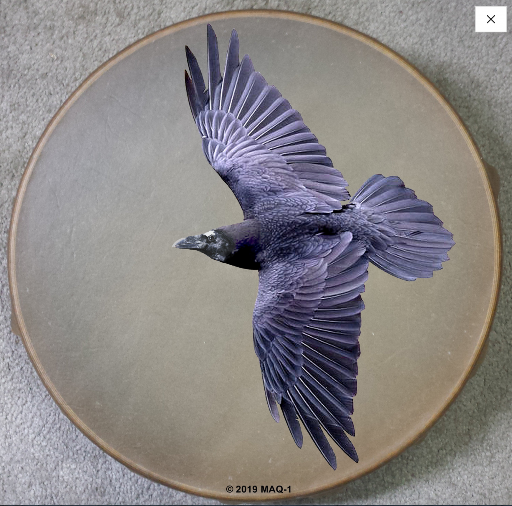 Raven in Flight drum. Marta Quest. Raven is the symbol of Crones Counsel, stemming from a numinous dream of a Raven, clawing my shoulders from behind, cawing “WAKE UP! WAKE UP! IT’S TIME! IT’S TIME! in the summer of 1989. Within days, this dream ignited both  Crone Chronicles: A Journal of Conscious Aging and, two years later, Crones Counsel.