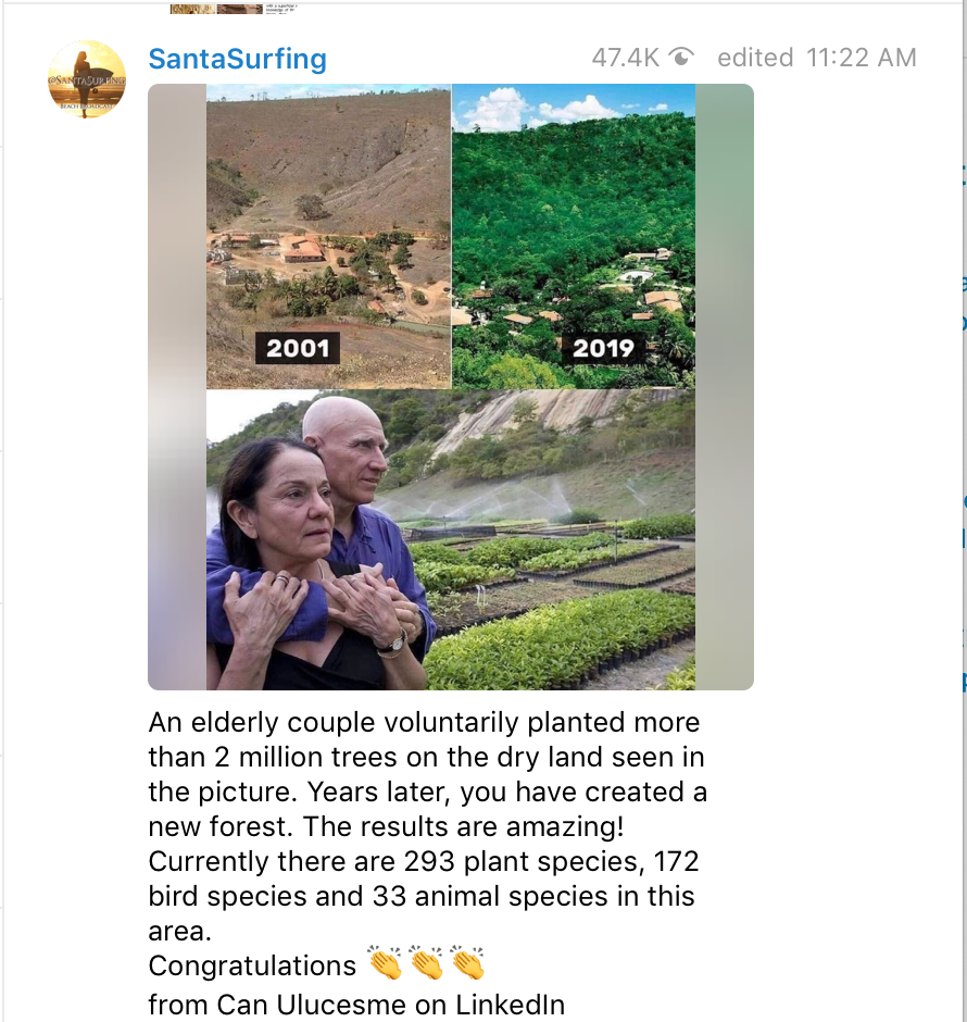 Okay, let’s swing back to what’s right about this world. Remember this story? Heartwarming. One old couple brought an entire hillside valley back to life by planting trees. The result? Species of all kinds flocked, crawled, ran, flew in to celebrate and partake of nature’s welcoming abundance.