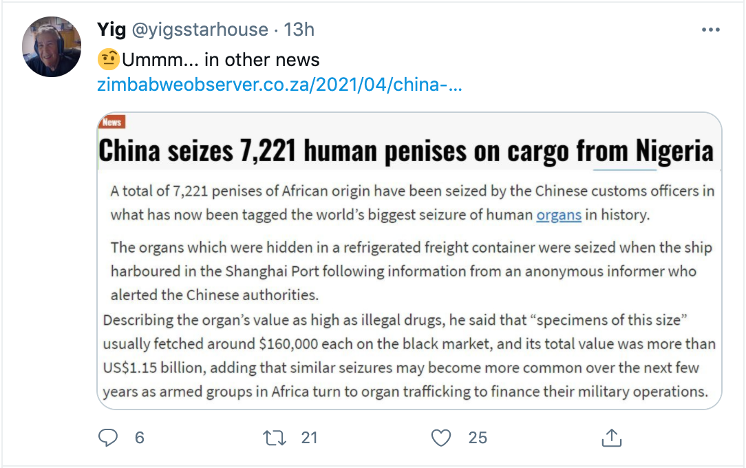 But for me and others like me: having been clued in to the global trafficking of children for many years now, there’s simply nothing that fazes me anymore. Not even this, which I found early today: “90 thousand penises in container found by China.” Can’t remember where I saw this, but the container was from somewhere in Africa. Nigeria? Each penis brings big money, of course.