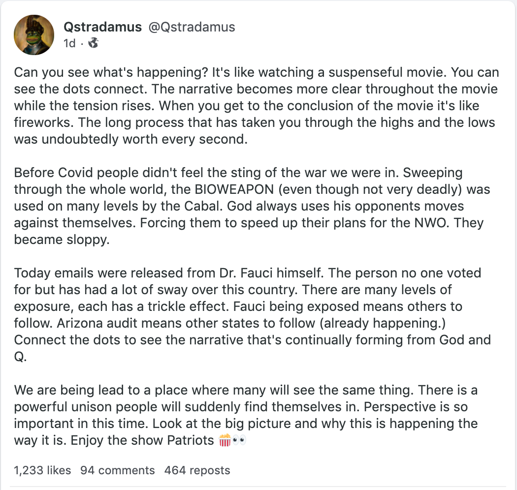 The covertly political/medical/pharmaceutical/media-driven/conspiratorial/”authority”,”expert”/academic/CDC/NIH/WHO “disease and vaccine” tsunami with Fauci-as-tip-of-spear focus, and the overtly political/technical/ technological/conspiratorial/media-driven/forensic audit election tsunami with Arizona-as-tip-of-spear focus. I sense great and equal momentum in both “movements,” extruding, surging, boiling, up from the collective unconscious below, as an enormous (supernatural?) onrushing revelatory wave beyond comprehension to the merely rational human brain.