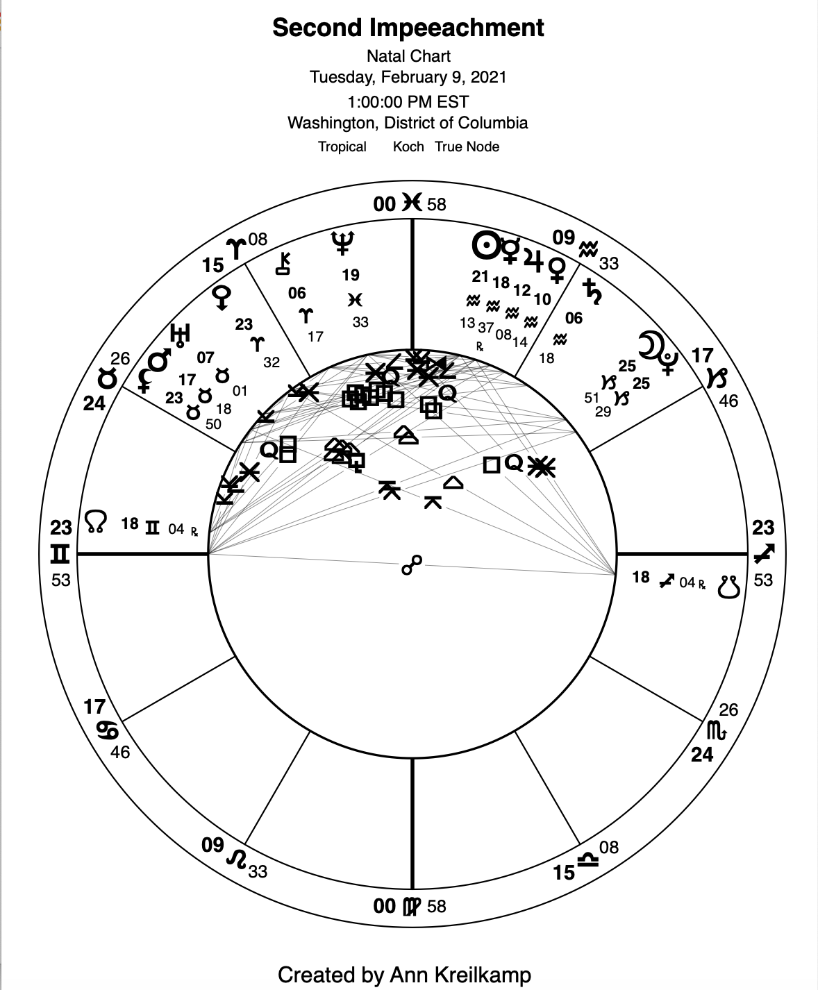 Though this second Impeachment trial is slated to continue possibly through Sunday, February 14 (Valentine’s Day!), when I look at the astrology of this latest political drama, frankly, I doubt it will last more than three days — and will feature a number of unexpected, startling, eruptive, even revolutionary moments ( each one timed to coincide with Moon’s crossing one of the stellium planets?)