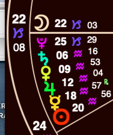 But lookee here! At the moment I looked at the chart, I couldn’t help but zero in on the rapidly moving Ascendant, that point rising in the East: 22°s Capricorn, for it was exactly conjunct the Moon. In other words, the Moon (which moves one degree every two hours) was, during that four minute window, just rising in the East! Bingo! Synchronicity!