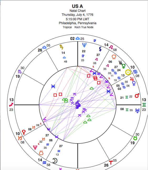 Pluto has been traveling through the opposite sign, Capricorn. Saturn is catching up with Pluto. Pluto, for the U.S., will make its first return to its own natal place between now and about 2025. It’s on its way now. We are feeling it. We are participating in the long, agonizing death throes of the American Empire that only a young adolescent nation with not even one Pluto cycle under its belt would want to try. This nation is about to learn what real power is, and it’s not military domination.