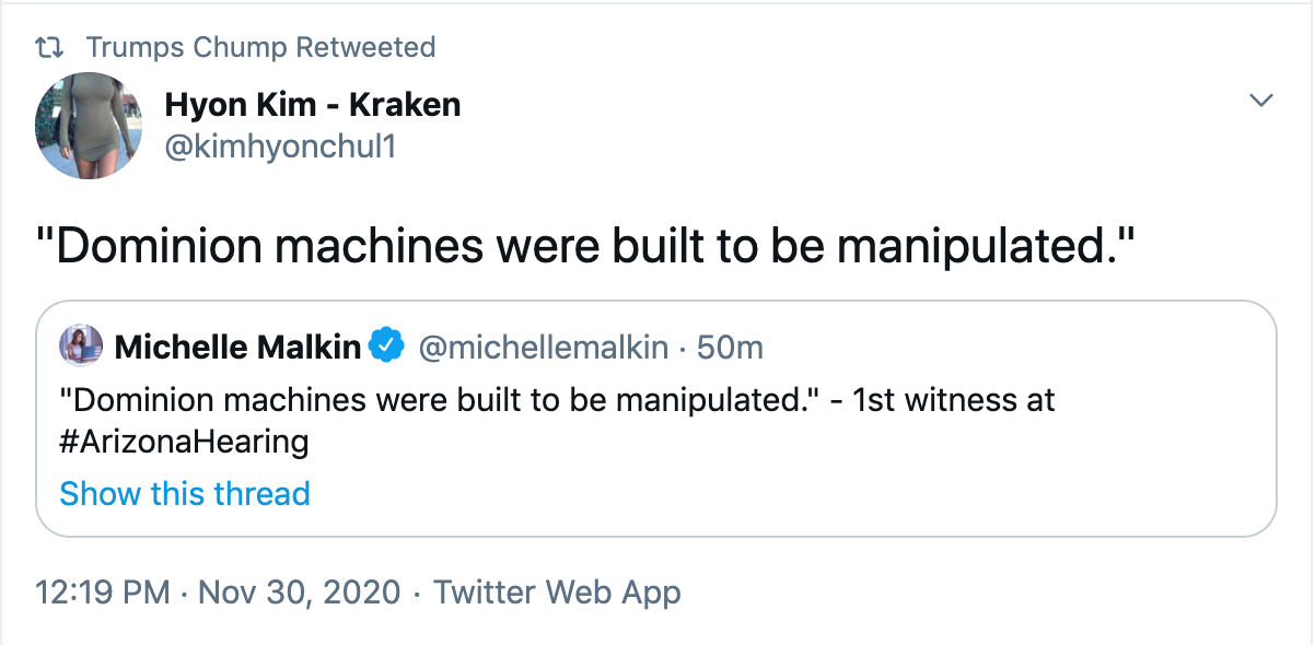 Oops! I see that Arizona has just “certified” the election results, in the middle of the hearing that demonstrates Arizona voter fraud! Just search that phrase, and you’ll find oodles of MSM articles about it. The MSM is drooling, as usual, over anything which looks like a “loss” for the Team Trump.