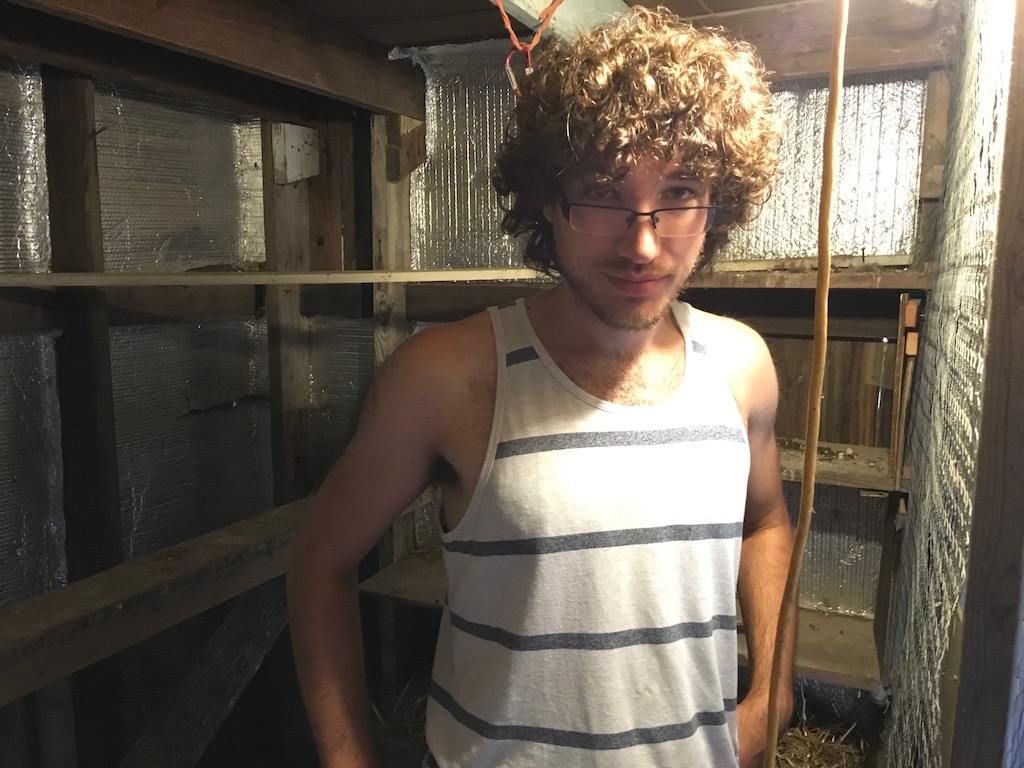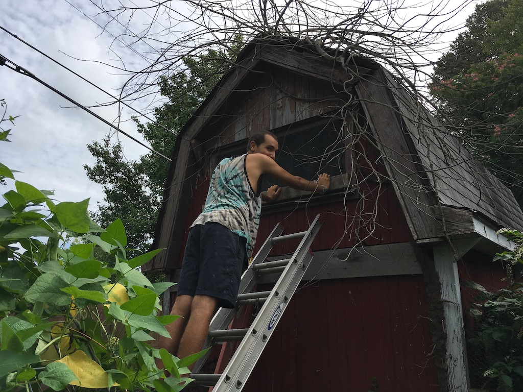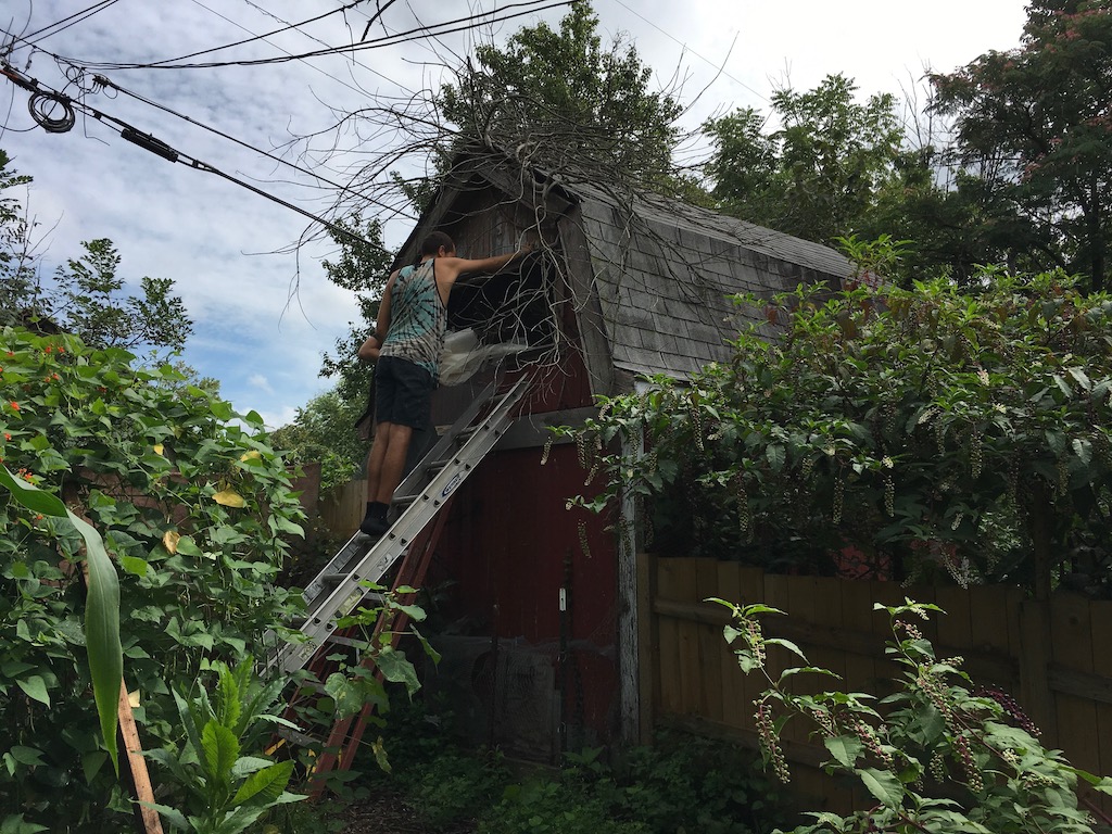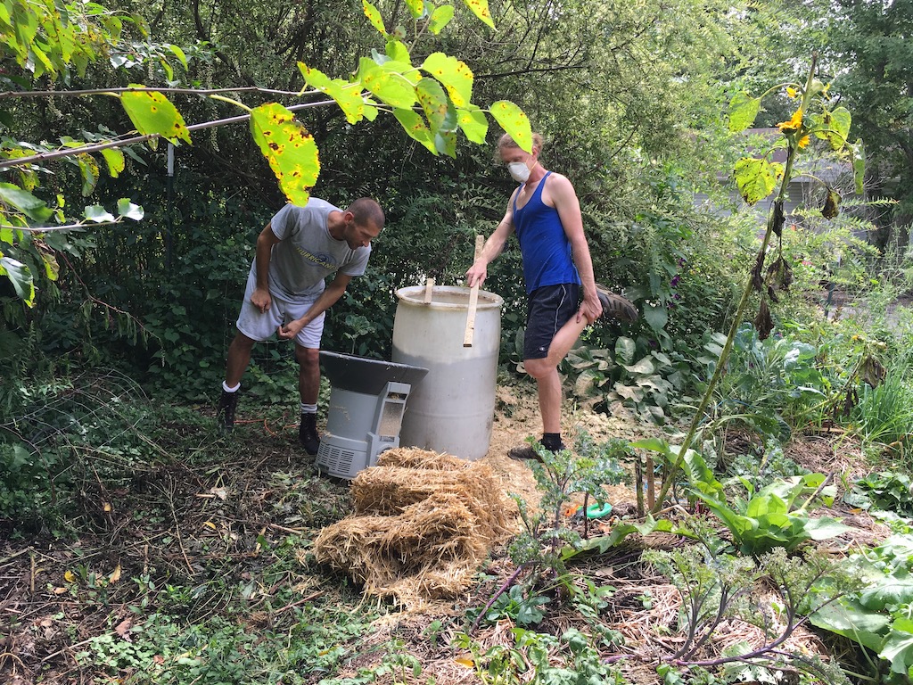 Three tasks: one group to put fix the chicken house to the point where the weasel can no longer get in (we figured out it must be a weasel that, one by one, killed five of our eight young chicks with a wound behind the head, and then did not eat!). Others to harvest beans and tomatoes. Still others to grind up a bale of straw for a new compost pile.