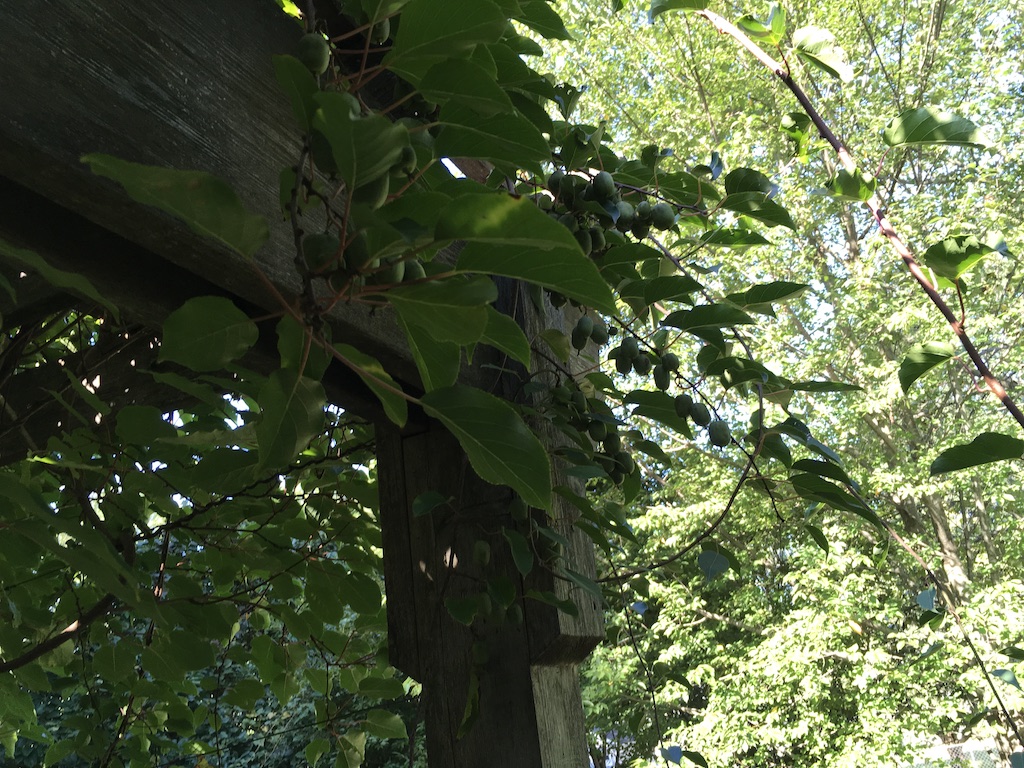 This three home village has transformed into a world of its own (first time visitors invariably call attention to this fact: “It’s as if this is another world!”). And part of that has to do with all the big and little outdoor spaces we’ve created here, each with its own function and evolution. Today, BTW, I’ve got to go get some kind of netting, so we can catch the kiwis as they fall from the rafters at this Overhill house . . . Otherwise we just squish them unknowingly, with our footfalls on the porch, or they land on the plant covered ground beneath, never to be seen again by humans. See ’em? Mostly in the light, on the right.