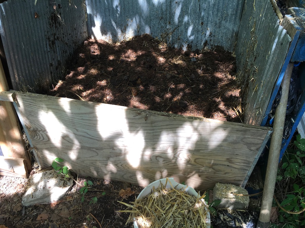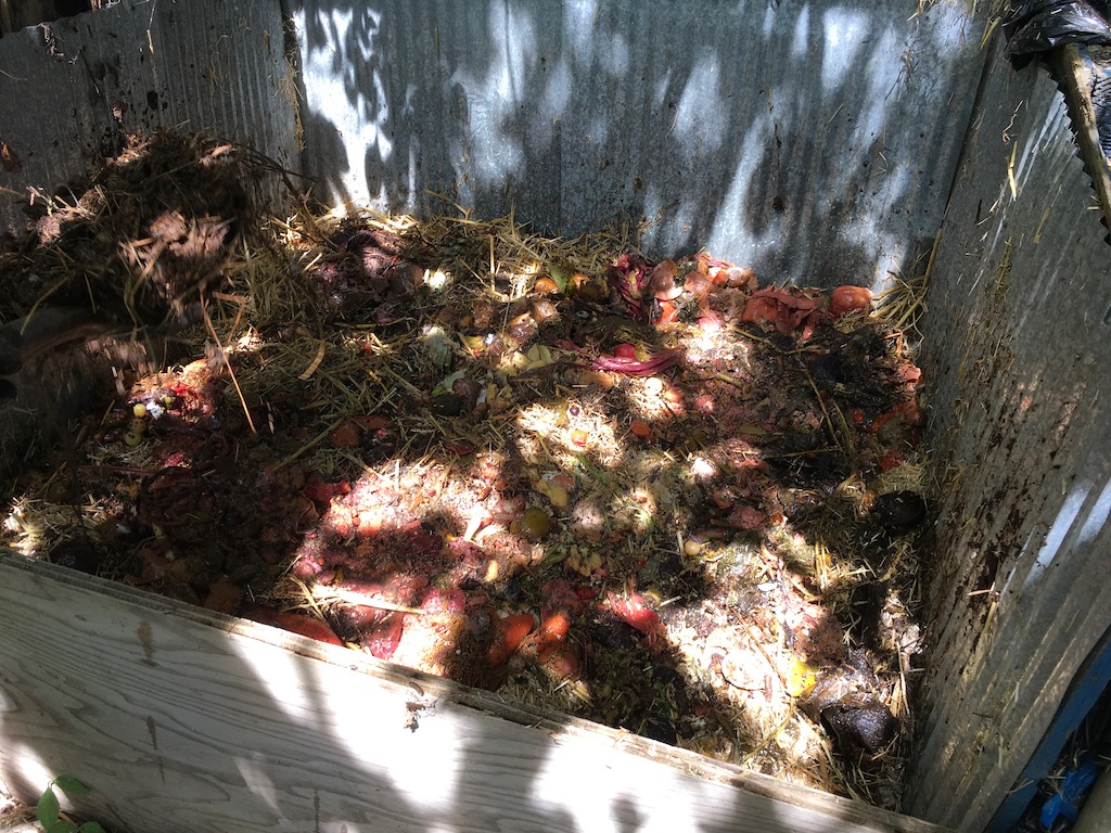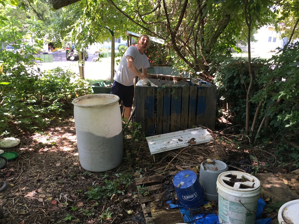He tells me that the food waste (of which there were probably 20 buckets worth at that point from the three houses) was just extra — to layer with the carbon and nitrogen. Okay!
