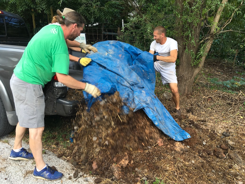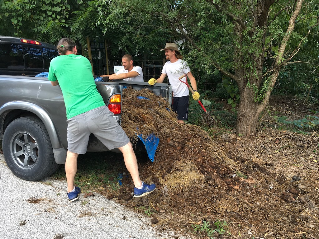 One day later, we all got a text. Solan and Logan (he and his family live across the street, AND THEY HAVE A TRUCK!) were coming in with a load of horse manure from a nearby farm, thanks to Annie’s agency (see last post). YES! Who can help? Chris put on his boots immediately.