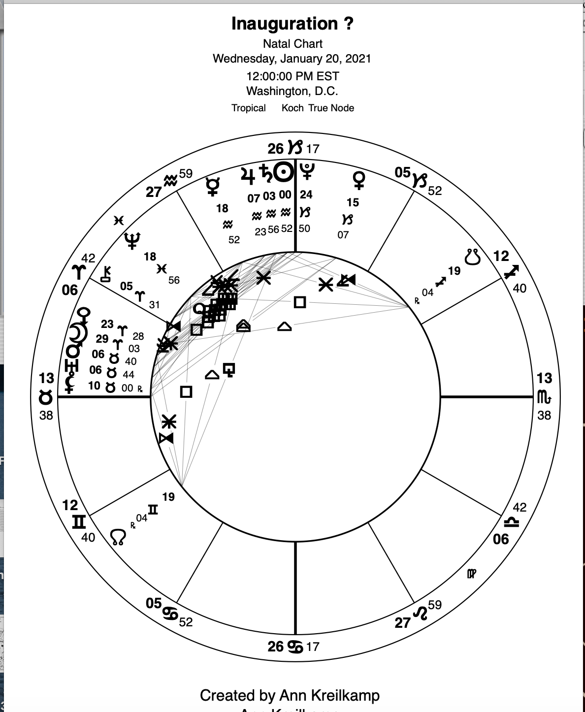 On my way soon to weekly acu-torture session, but did want to point out that not only is Installation Day the day when Mars is closest to exactness in its conjunction to Uranus, i.e., explosively unpredictable, (Mars at 6°40 and Uranus at 6°44 Taurus) but that the Sun now occupies 0°52 Aquarius, on the exact degree that Jupiter and Saturn occupied on Winter Solstice, the formal beginning of the Aquarian Age, and that, moving one degree per day, the Sun begins illumine Saturn (now at 3°56 Aquarius). Expect that the situation is going to get more and more serious, seemingly finalized, but then, just four days later, the Sun will pass over jubilant Jupiter (now at 7°43 Aquarius). Meaning? You tell me!