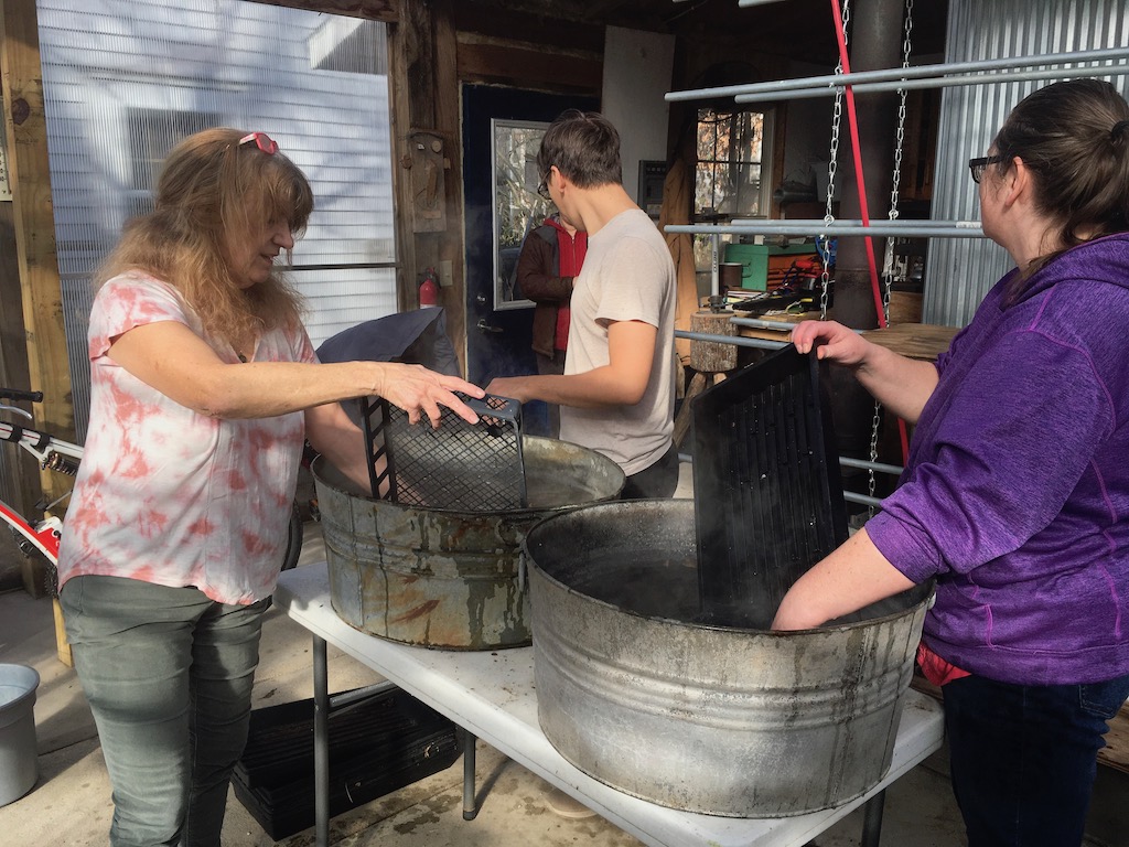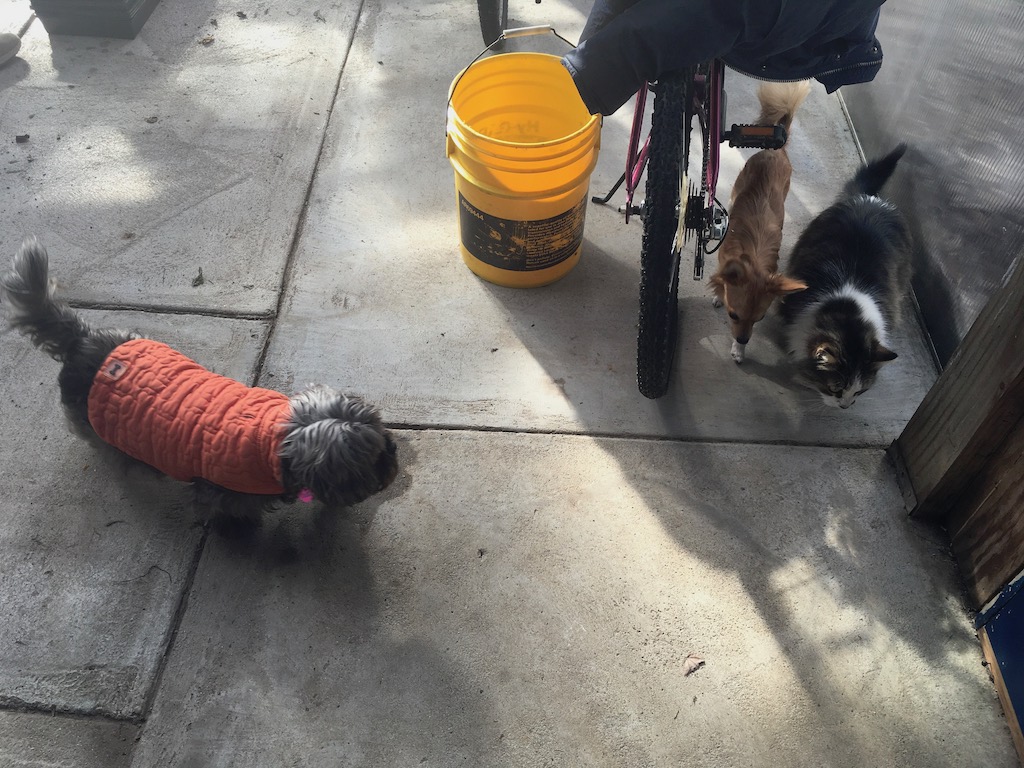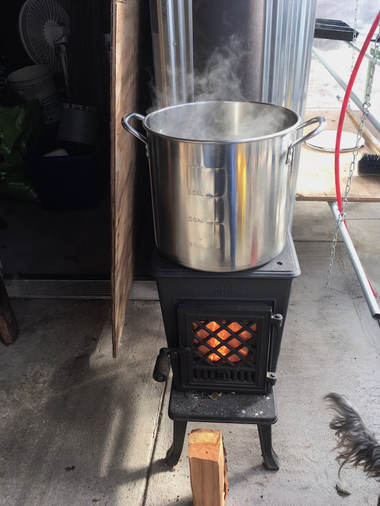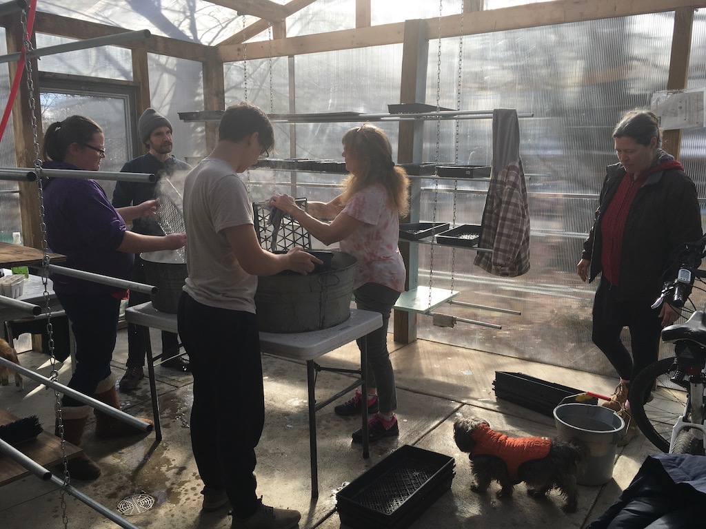 While my own frittery mind is mostly otherwise occupied, we are proceeding, here in Green Acres Permaculture Village, with our “growing community from the ground up” life as usual. Which means: it’s January, time to start preparing to plant seeds. All year long, we have two morning 1 to 2 hour “work parties” each week. This past Monday, we sterilized the green house itself — walls, floor, shelving. This morning, along with two dogs and a cat, we sterilized gobs of tiny seed containers and trays.