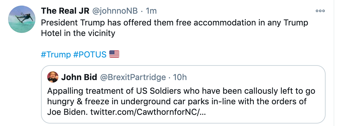 Okay, all the above is about the most complex I can get in terms of my own 78-year-old mental peregrinations. By the way, I did see this morning that Trump offered any of his nearby Trump hotels to the thousands of troops that were banished from the Capital to the parking garage.