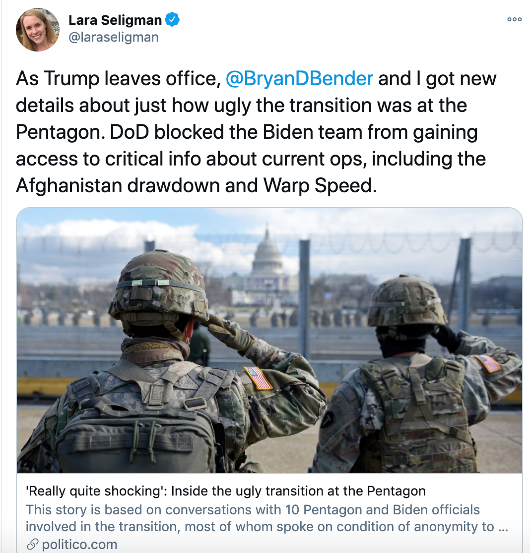 It does seem to be obvious that the Pentagon isn’t playing along with the fake “presidential” orders? requests? —and that, in fact, there do seem to be two parallel “governments” now in place, a fake one, and the interim military one. Keep in mind that the attitude in the article mentioned below is from left-wing Politico.