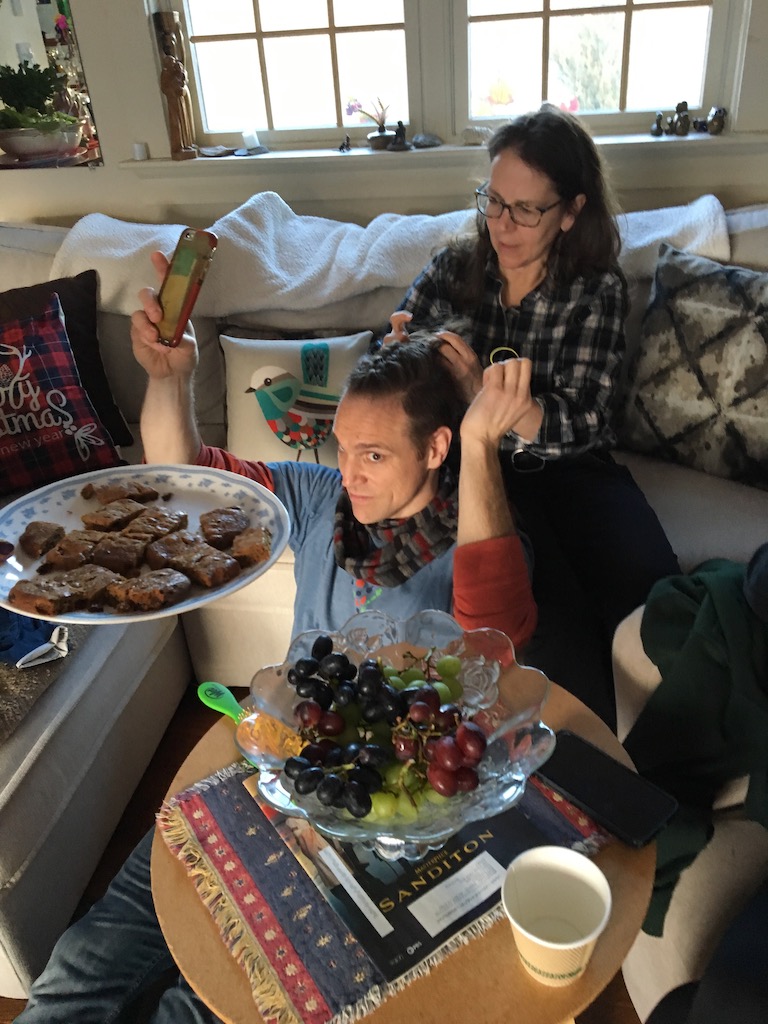 At one point Gil asked Sue to please french braid the long hair of his modified mohawk and put it in a topknot. Here they are, complete with plate of cookies Nancy has just extended . . .