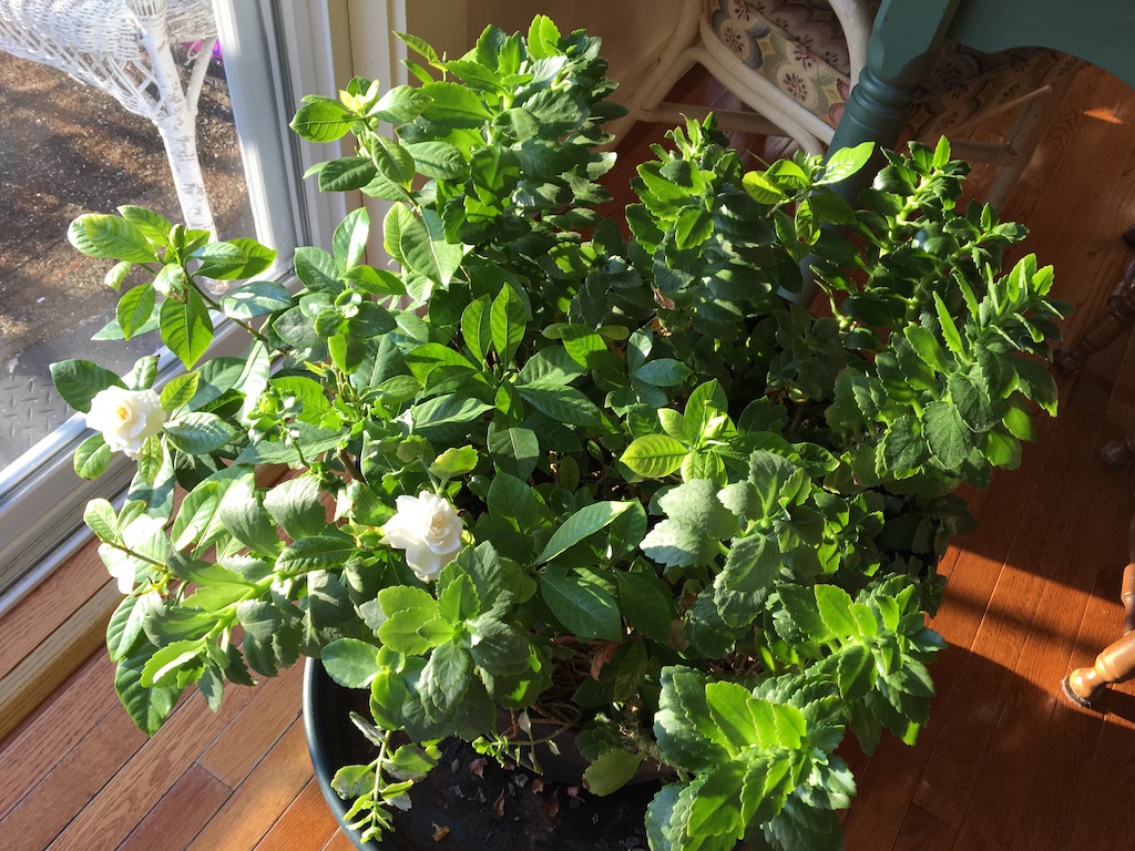 All that afternoon light helps her indoor gardenia to thrive in winter! I smelled one of the open blossoms. Heavenly! And there are many more, set to open.