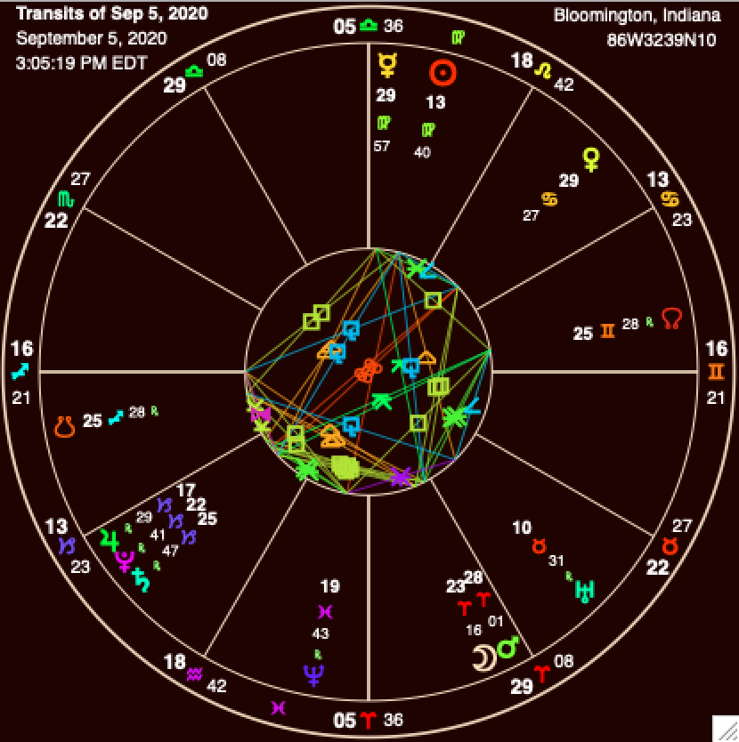 Neptune at 19°43 Pisces, as usual, sextiles Pluto (with Saturn, Jupiter). Remember to notice, also, that since late July, Mars, today at 28° Aries, has been “triggering” the Jupiter/Saturn/Pluto complex, from Aries, via a tense square (90°), and will continue to do so until the end of the year and into the first week of January. We are in for a long siege of hot-blooded, foolish, impetuous, Arian behavior from those who are mainly unconscious and/or mind-controlled (think Antifa especially); and we are in also for a long siege of surging courage rising up from the grassroots, over and over again, in many ways, defying both the rioters and the Saturn/Pluto draconian orders and lockdown, taking advantage of the cracks opening up as the no longer viable structures disintegrate.