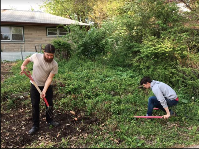 While I’m busy squirting, Dan, with Evan’s help, has been busy reclaiming old permaculture beds in front of the new DeKist house. That means, using a garden fork to unearth the thick mat of vines covering the entire garden. And there’s still more to go.