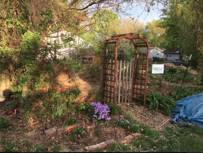 Finally, here’s a recent view of the garden gate and sign, with composing center beyond, leaves and other carbon matter stored just behind the fence.