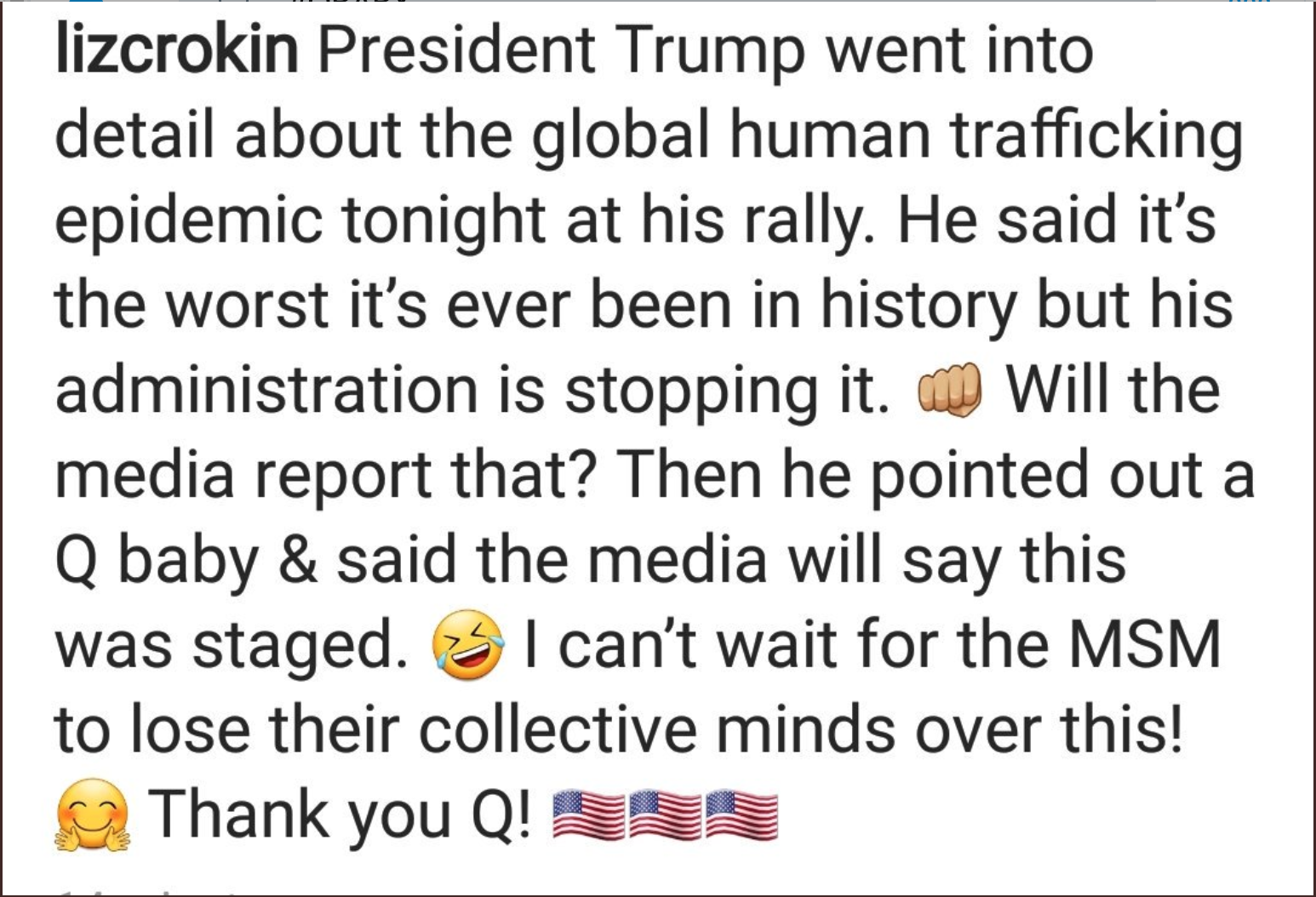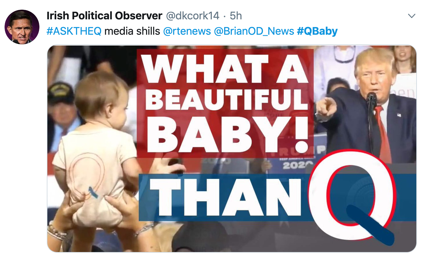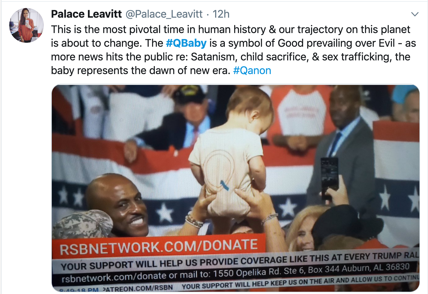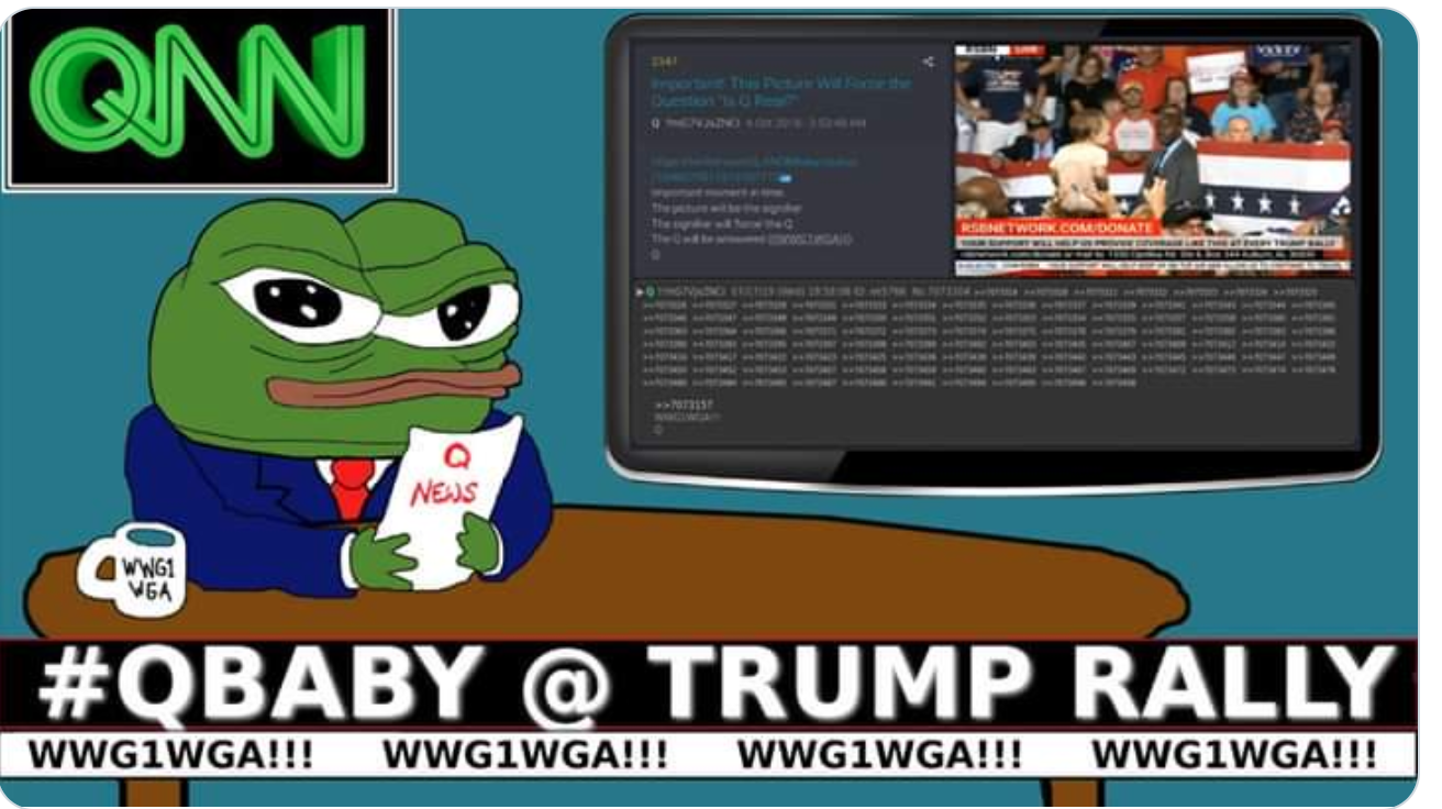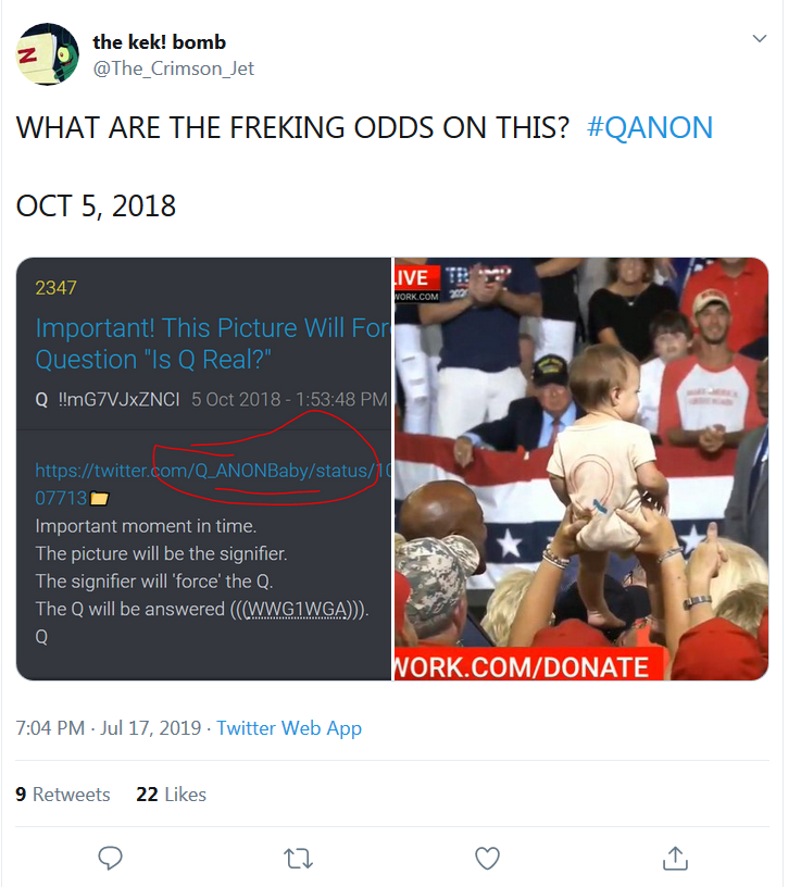 Someone asked, but did Trump see the Q on the baby’s back? Seems like he did. Before the dad turned his baby around for the crowd to see, he had held the child to his chest, while slowly and deliberately using his hand to smooth down the back of the onesie he was wearing. (Can’t find that short video now, though I did see it!)