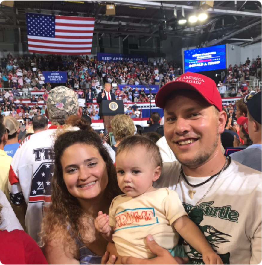 Here’s the front view of the baby and parents, with TRUMP on his chest.