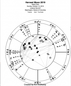 Notice that both planets are in the signs they rule, wherein they feel most at home, and so then act in stronger than usual ways. They have been more or less 90° from each other since way last January, 2019, and one might say that this upcoming Harvest Moon signifies the culmination of this stressful aspect that has linked them together, for good or ill, for it will be nearly ten months.