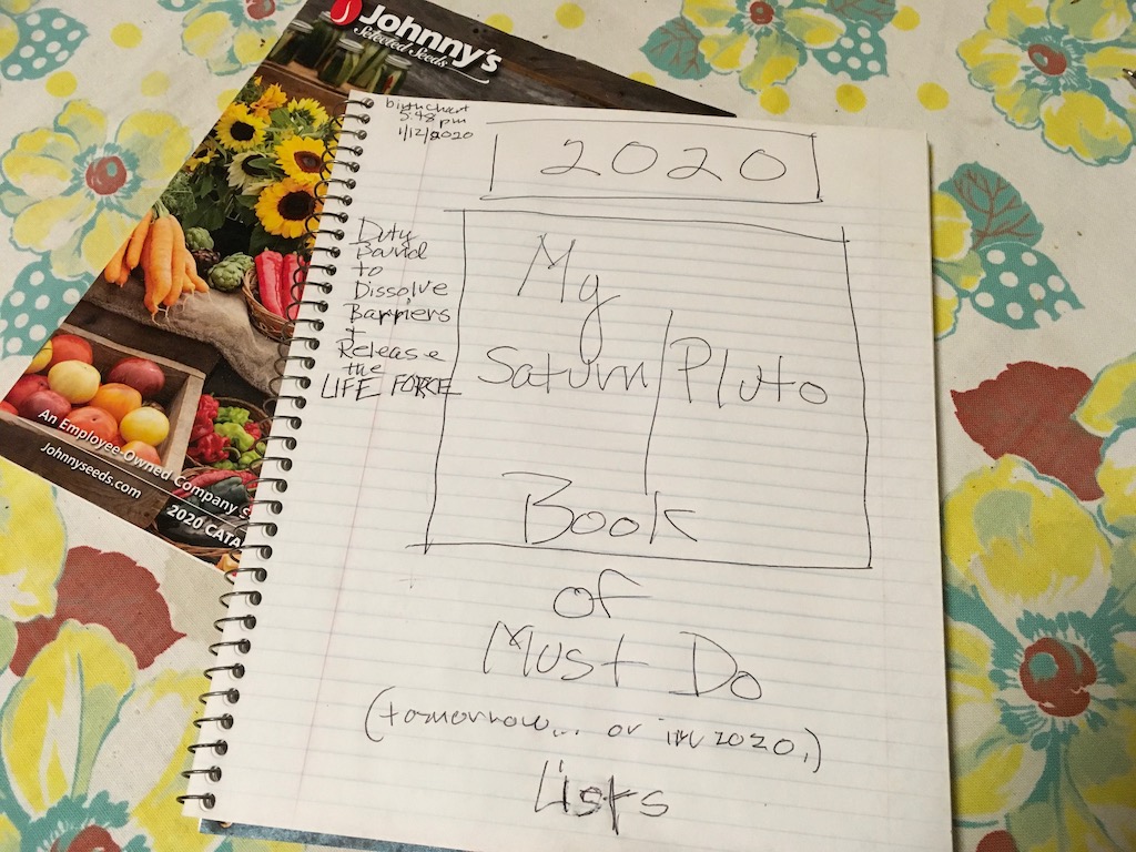 So then, I decided to do the chart for this occasion, this sudden (Uranus turned to go direct on 1/11/20) poke through the barriers of habit (Saturn) to experience the onrushing life force (Pluto) through my body/mind/spirit, by setting up a structure (Saturn) that will contain my “work hard, get it done” (Saturn) To Do Lists for the entire year (Saturn: planning).