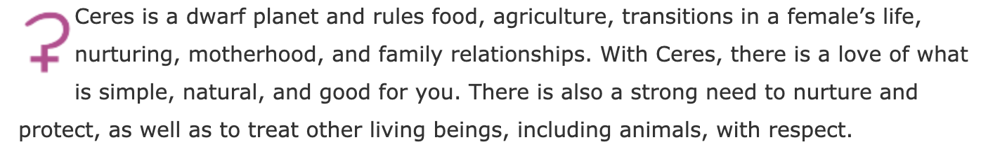 And hey, guess what? It turns out there is an asteroid also in the mix, exact, to the same 22°-23° Capricorn degree! Ceres, though its symbol doesn’t show up on the chart, at 22°31 Capricorn yesterday also.