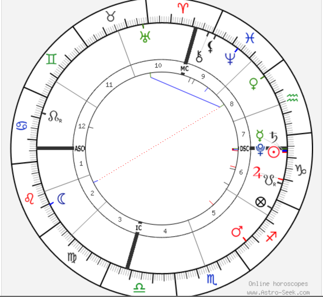 So, here’s the chart, and notice how the swiftly-moving Descendant, one of the four angles, is featured: this point, which moves one degree every four minutes, and symbolizes the point where the energy of this time and day and place meets the world, just happens to be exactly conjunct the Saturn/Pluto conjunction! And note also that this conjunction also just happens to conjunct both communicative Mercury and the Sun itself, illuminating the Saturn/Pluto climax day!