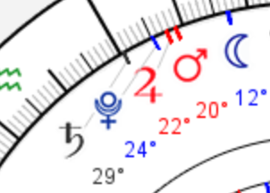 Today, notice that Mars is within two degrees of Jupiter, making everything that happens bigger, more sweeping. Jupiter itself is now at 22°, only two degrees from Pluto. So the three planets are in a tight four-degree conjunction. Boom!