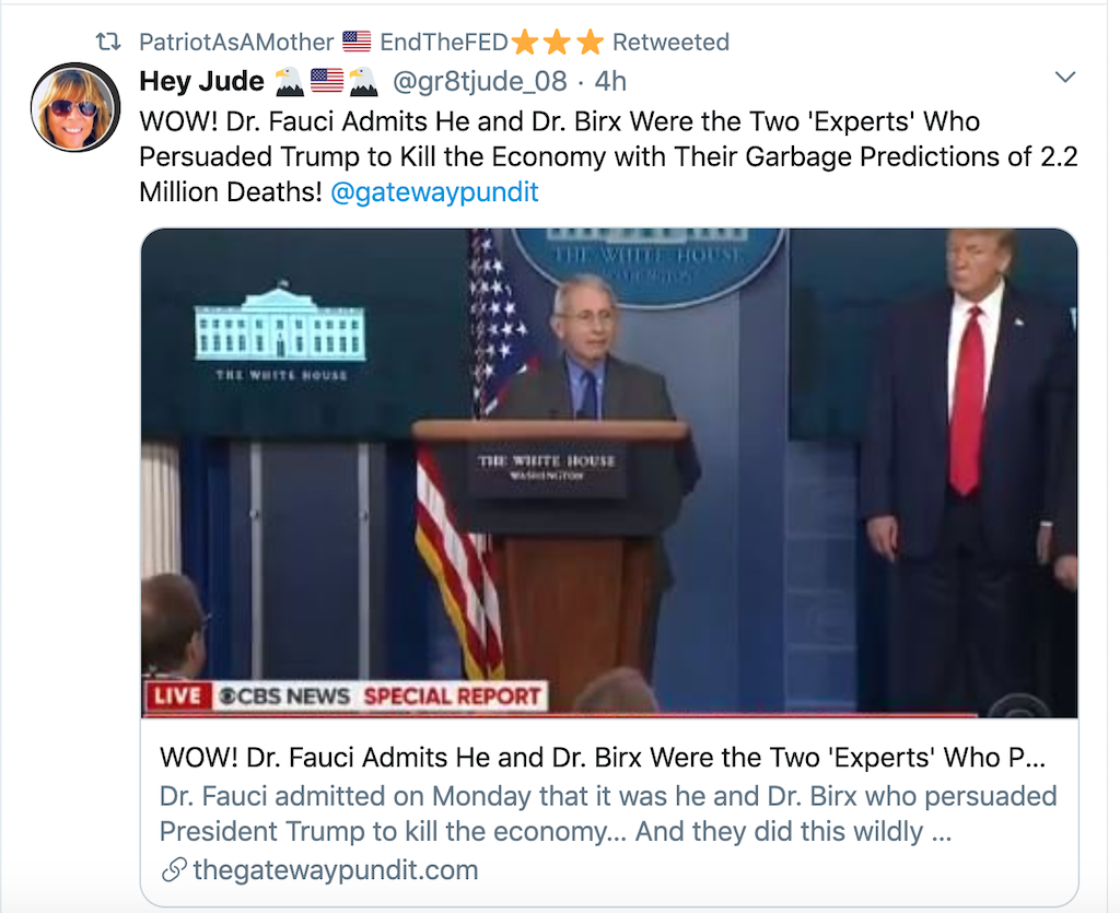 And guess what? Yep, the two people who walked into the Oval Office to tell President Trump that the CV would kill 2.2 million people were Fauci and Birx. Are we surprised?