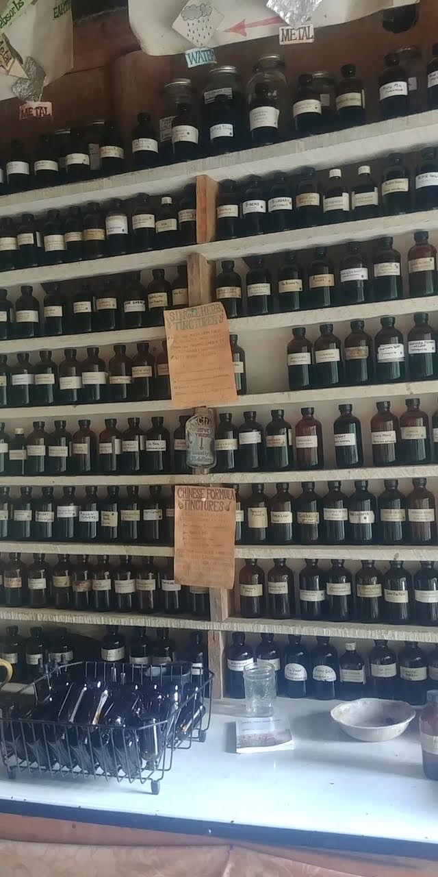 But it turns out that she didn’t get to experience Mountain Gardens either, because when the group arrived (a few miles away, at the foot of Black Mountain), it had already started that hard rain. So Joe Hollis, the proprietor and elder, spoke to them inside, instead, and though he spoke so softly she could hardly hear him, Charisse did manage to get a few photos of what I presume is their apothecary.