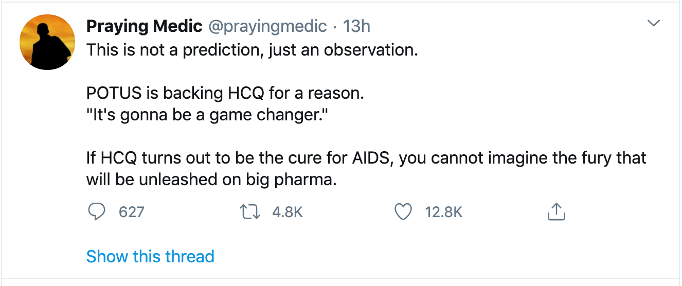 BTW: Praying Medic, on twitter, notes that hydroxychloroquine cleans the blood. So no wonder it’s a “cure” for Covid-19. And for others diseases as well ?