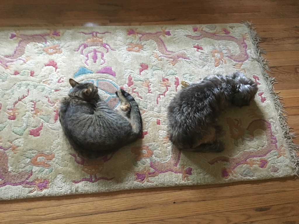 Puppy Shadow, shown here with kitty Tiger, in rare harmonious propinquity —