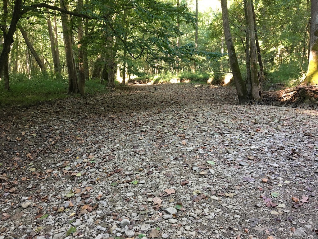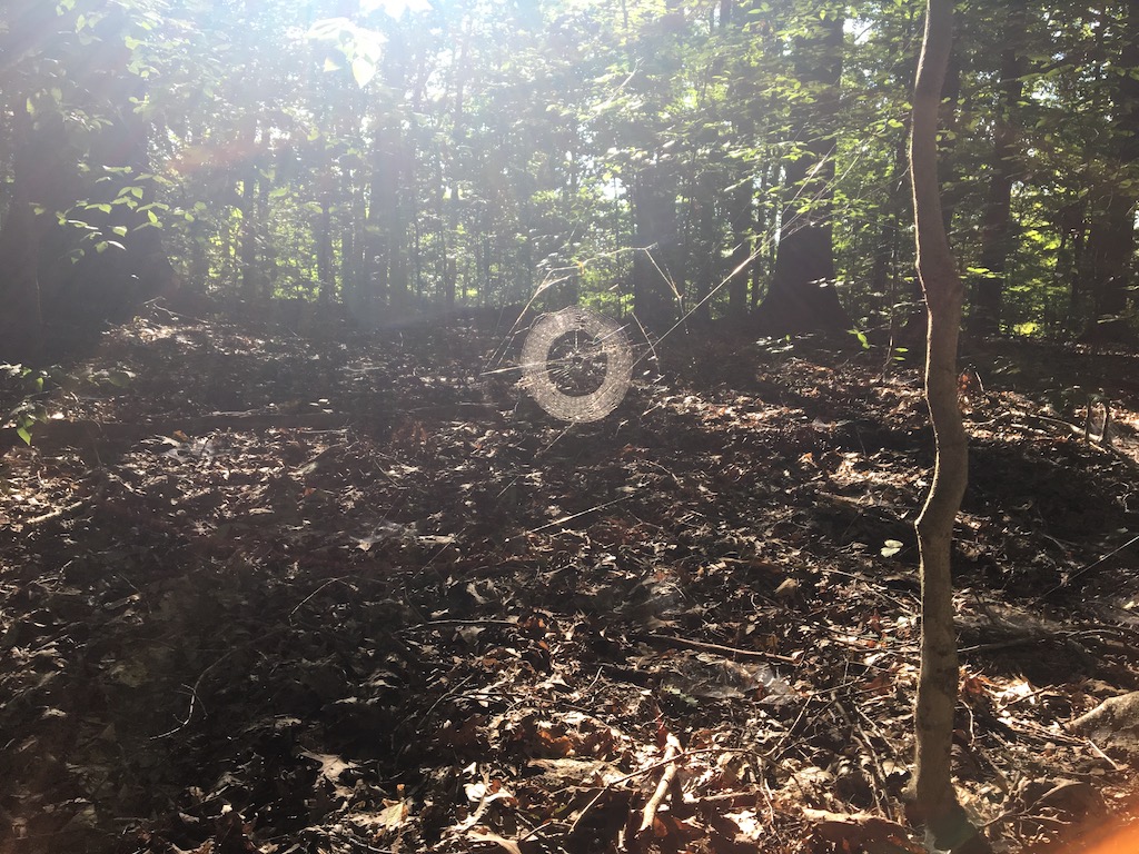 Memory started nudging . . . where and when have I seen exactly that form of spider web before? Aha! With grandkids Kiera and Drew, in early August 2018, when we hiked the Griffy trail with their uncle Colin. Notice, not one but two photos of the same kind of web . . . And notice too, from the photos, how luxurious the growth was then, and here we are, two years and one month later, already inside the season of decay. So much drier this month than last!