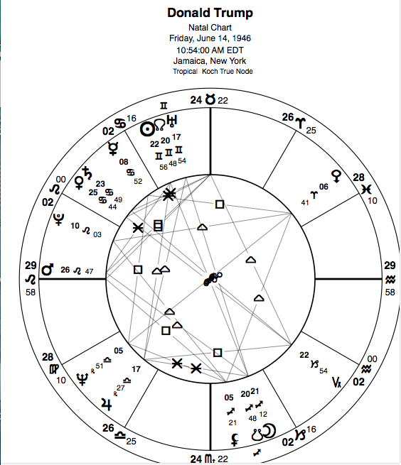 Now check out Trump’s chart, born under a full Moon in Gemini/Sagittarius, with the planets reversed, and ALSO AT 22+°.