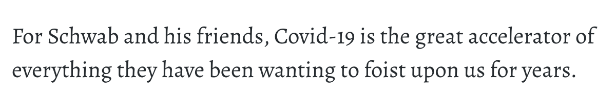 This long essay by the founder of the World Economic Forum offers an example, and indicates the central role societal changes wrought by the long-planned, and now ongoing so-called Covid crisis plays in bringing in the larger technofascist, transhumanist globalist agenda.
