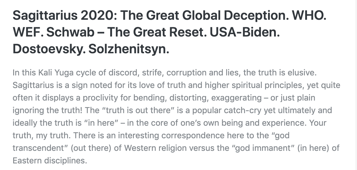 Reading through his Fourth Industrial Revolution screed, I began to wonder about Schwab’s astrology (a four-planet stellium in pioneering Aries) and searching for it, found this, esotericastrologer.org, an amazing website that I have never seen before, with a new article on Sagittarius that places even Schwab’s gigantic vision in expanded perspective.