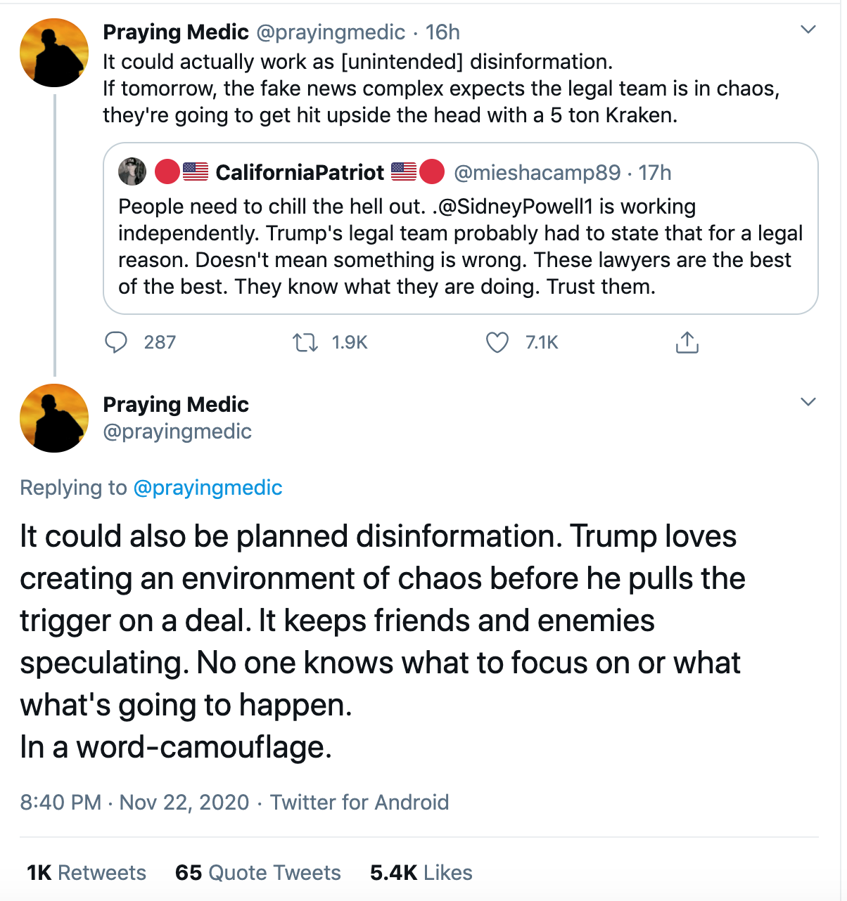 Then there’s the Trump 5D chess version, which has many variations, some of which are detailed in these two threads, one from #RattlerGator, the other from #Praying Medic. The first pulls a detailed gestalt from the swirling currents; the second inspires others to put in their own two cents as to what actually happened.