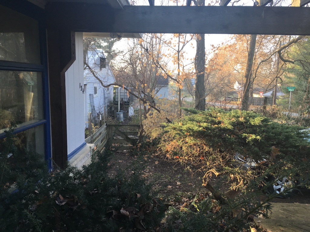 Here’s a photo taken early morning a few days ago, in the early morning. Can you spot Tiger kitty? (Hint: He’s on a diagonal tree limb about midway heading down.) Great colors.
